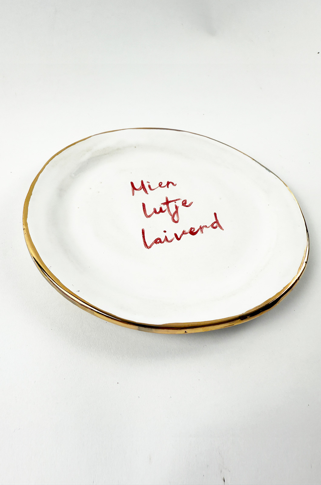 Handgemaakt wandbord met de Groningse tekst – Mien lutje laiverd (mijn kleine lieverd) met een écht gouden rand.